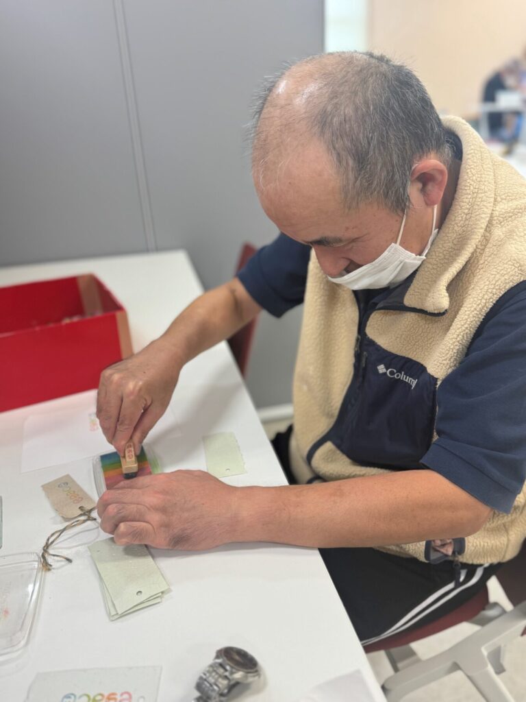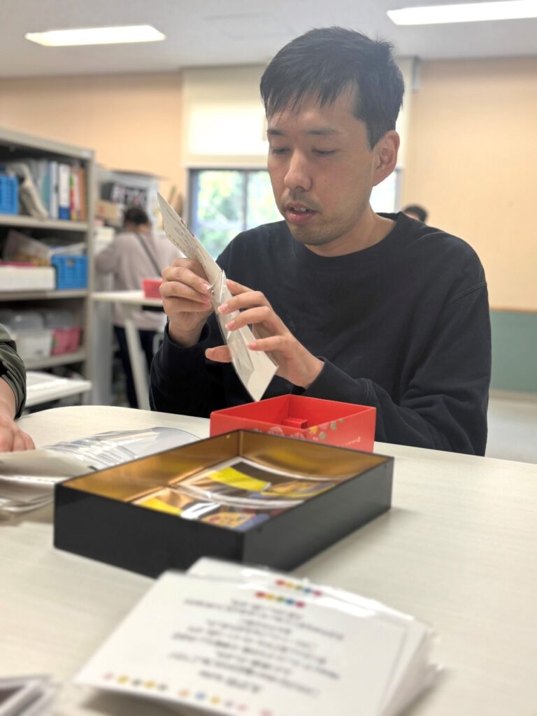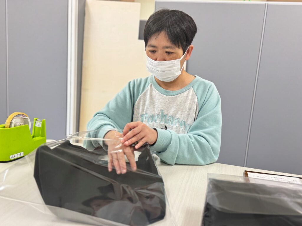 12月上旬、無事に製品が事業所に届き、先日より出品に向けパッケージングを開始しました。様々作業工程を分けることで、多くの利用者がこの販売に関わることができ、工賃獲得に向け頑張っています。