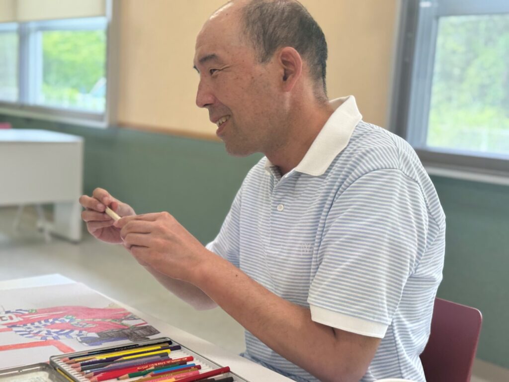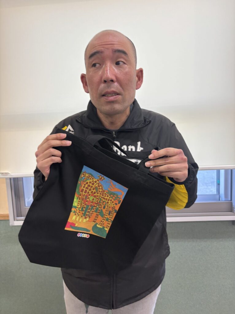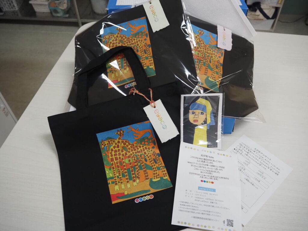 生活介護(創作)では、日々のアート活動から生まれた利用者の素晴らしい作品を、多くの人に見てもらいたいという思いから、新しい取り組みとして、企業と連携してオリジナルバックの作成を開始しました。