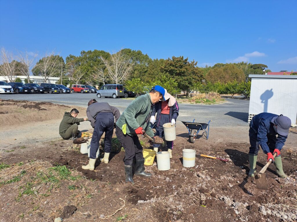 地域応援団のエールを受けて、就労継続支援B型事業の皆さんは、もっともっと美味しいお野菜をお届けすべく、収穫を終えた畑に草チップを散布して、春夏野菜の準備に備えています。