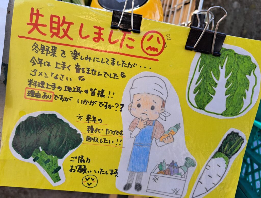 訳あり野菜ではありますが、利用者さんの思いを伝えるポップを添えて、マルシェに並べて見ました。