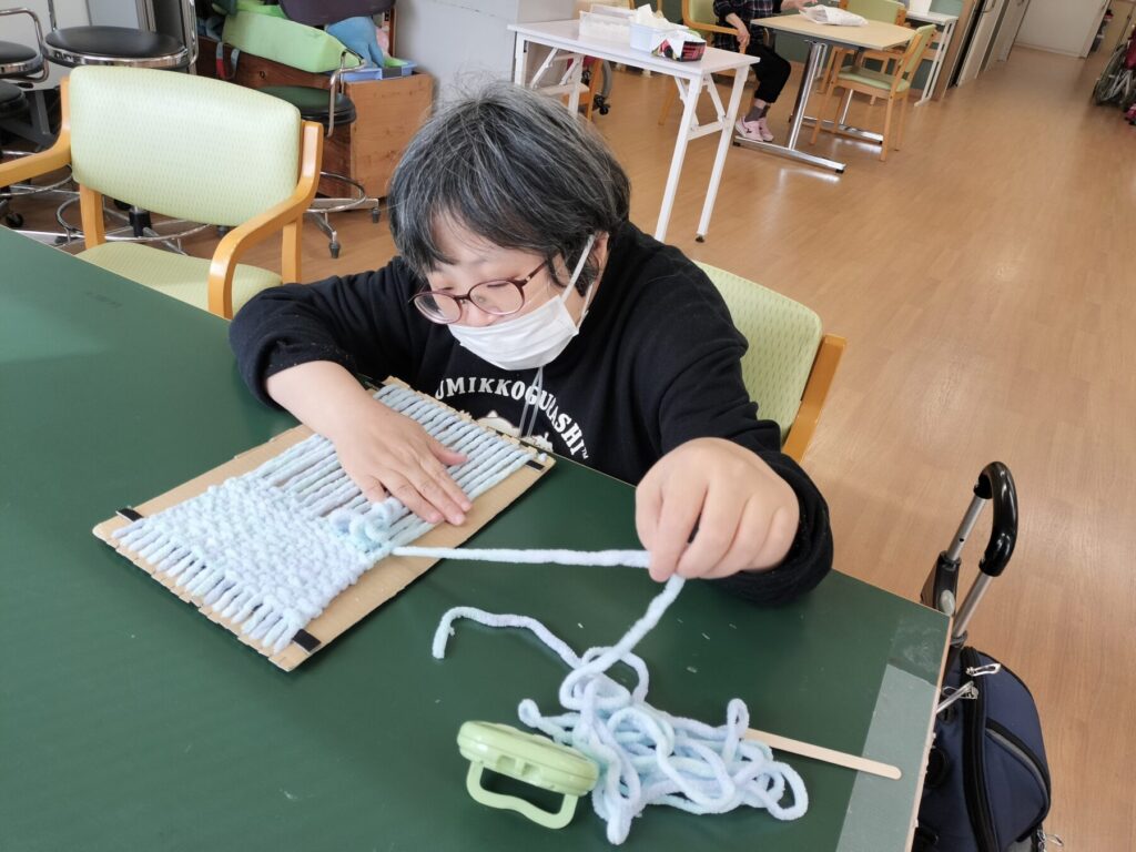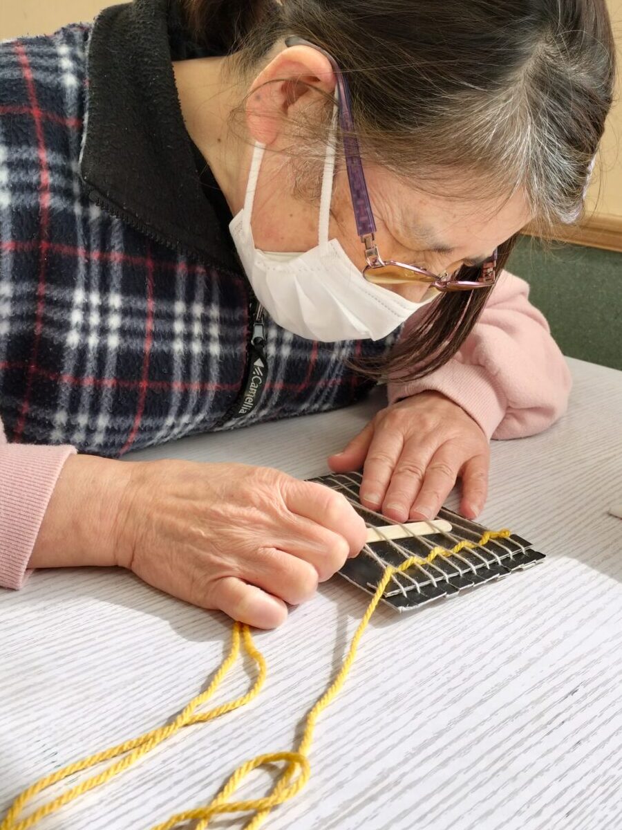 入浴サービスでは新たに編み物を使った作業を取り入れました。段ボールで作った織り機でコースターやバックを編んでいます。初めは編むのが難しく、糸をとばしてしまったり、形がいびつになったりと苦戦しました。段ボールに工夫をしたり、何度も練習して先日、ついに商品として出せるようになりました。