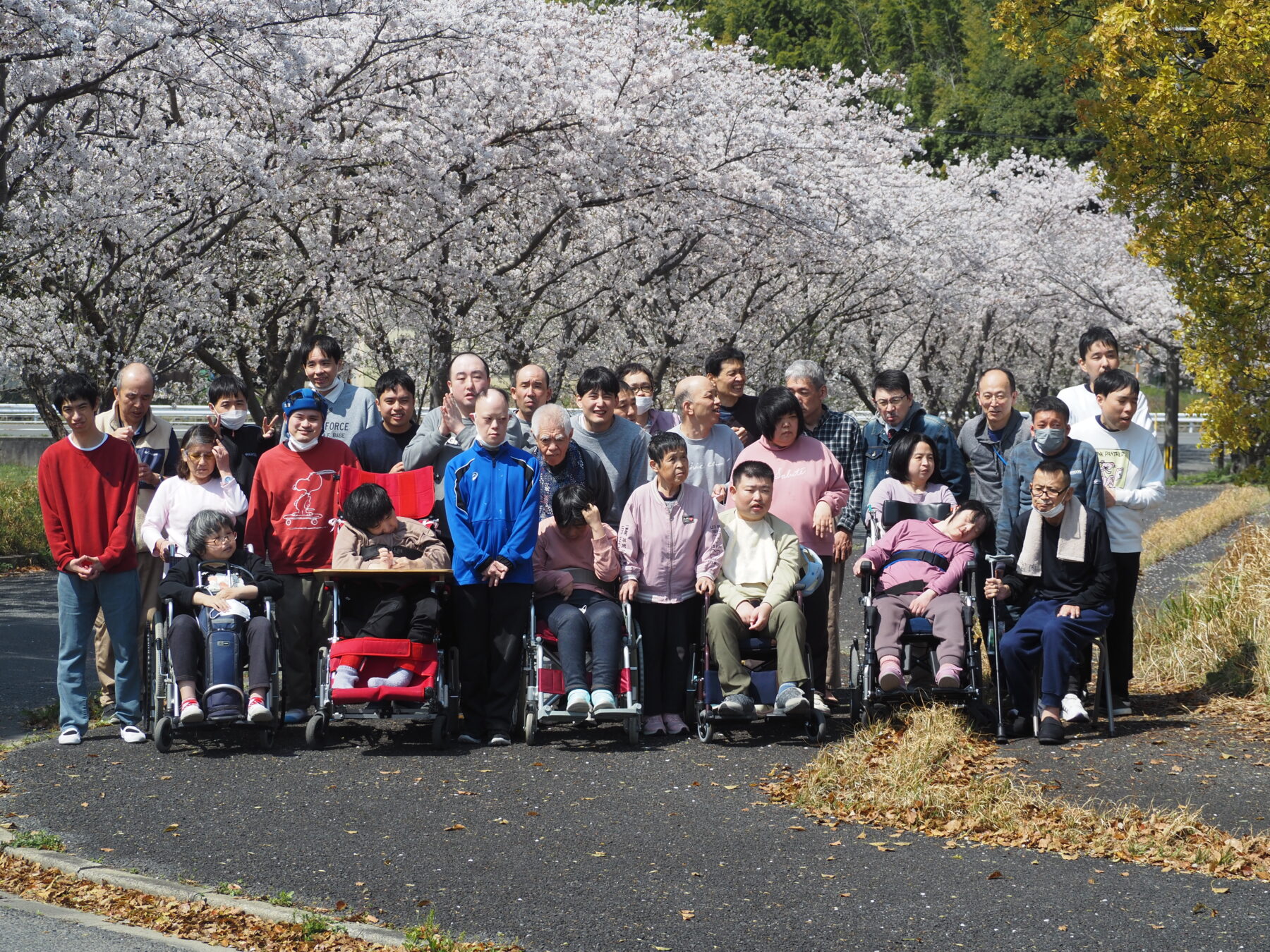 先日まで雨が降っていたため花が散らないか心配でしたが、本日は晴天となり、生活介護全体で写真撮影を行うことができました。暖かい風を感じながら、ウトウトする利用者もいましたが、最後まで笑いの絶えない撮影会となりました。