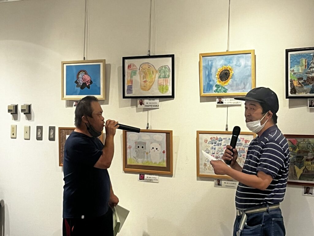 当日は、自身の作品を自身で紹介するギャラリートークのイベントが開かれ、Hさんが参加しました。Hさんの絵画作品のタイトルは「職員の笑顔」。3人の職員の顔を描いてくれていました。カラフルに塗られ、どれも笑顔でユーモアたっぷりの仕上がりです。トークでは「職員のみんなは、一生懸命頑張るし、笑顔が大好き」と最高の言葉を述べてくれたHさん。いただいたその言葉に沿えるような支援を行い、これからも皆さんを支えていこうと思えた1日でした。