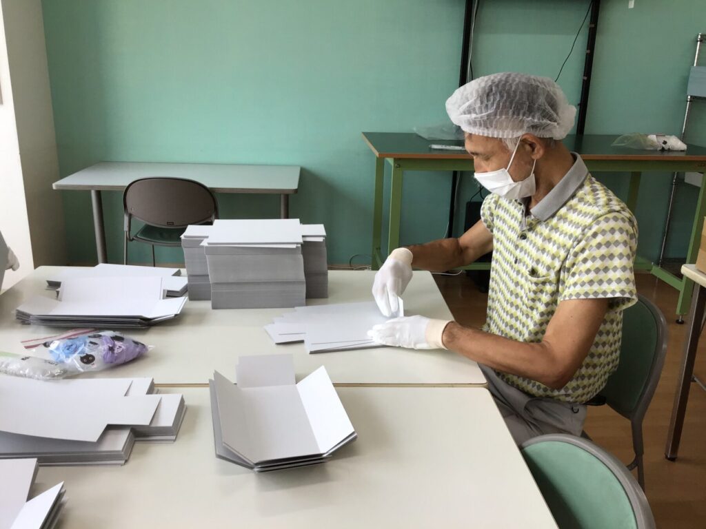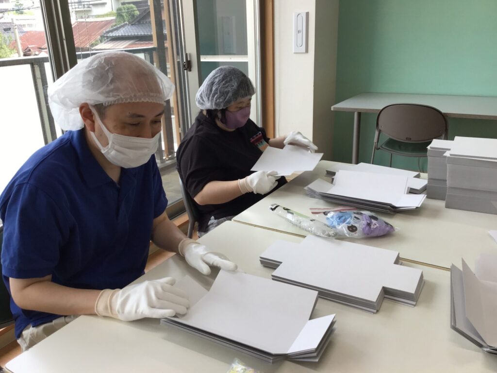 就労継続支援B型事業では、お菓子の箱折りの作業を行っています。商品を受け取るお客様のことを考え、丁寧さと正確さを心がけて作業に取り組んでいます。作業中はヘアキャップや手袋を着用し、衛生面にも十分に注意しています。折り目に沿って箱を綺麗に立ち上げ、汚れがないかの検品作業を行い商品が完成します。役割を分担しながら協力し、最後まで責任を持って作業を進めています。出来上がった箱が実際に商品として使われることで、利用者のみなさんのやりがいや自信に繋がっています。仲間と協力しながら一つの仕事をやり遂げる達成感が、次の意欲へと繋がっているのではないでしょうか。