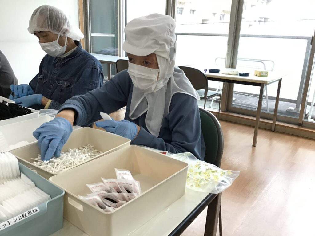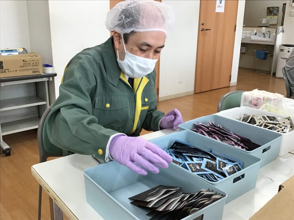 就労継続支援B型事業では、ホテルのアメニティを検品し、袋入れする作業を行っています。アメニティといっても色々あり綿棒やコットンを袋入れするものから、化粧水や乳液、洗顔のセットなどもあります。どのアメニティセットも順番や向きがあり、間違えないように入れないといけません。異物混入を避けるため髪の毛は帽子の中に入れ、使い捨ての手袋を毎回変えて慎重に作業を行っています。KさんもHさんも真剣な様子で黙々と作業をされます。自分が詰めたアメニティがお客様の手に渡ると思うと嬉しいと話されていました。