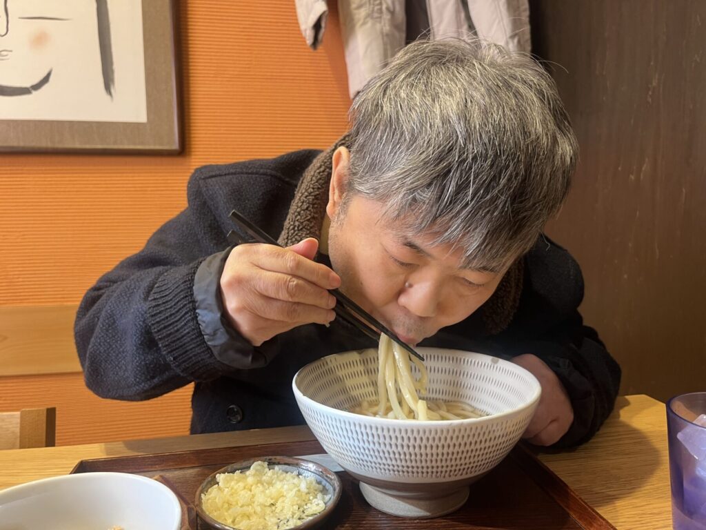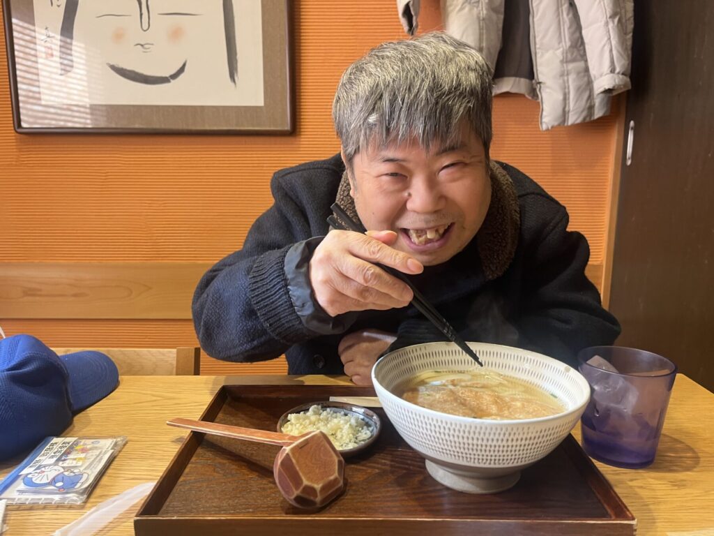 生活介護事業では、今月グループに分かれて初詣と外食を楽しむ企画を設定しており、「寒い季節は温かい物を食べたいね」と若松にあるうどん屋さんへ行くことにしました。年明けうどんは太くて長いことから、縁起も良く長寿を祈る縁起物として食べられてきたそうです。メニューを見て、「きつねうどん!これが良いんよ」と悩むことなく決められたNさん。温かい出汁や優しいおあげの味に心身ともに満たされ、にっこり良い笑顔を向けてくれました。