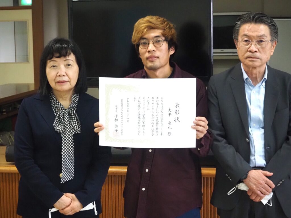 なお、同16日には日明リサイクル工房でも従業員の永年勤続表彰が行われ、勤続30年と勤続10年のふたりに小松啓子理事長から表彰状などが手渡された。