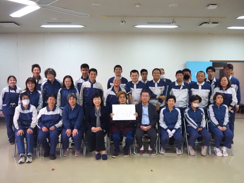 この日、従業員が司会を務め、一緒に働く他従業員や職員が祝福するなか、小松理事長から表彰状と記念品を手渡された0さんは「あっという間の10年でした。20年を目指し、また頑張りたいと思います」と挨拶した。同工房の元事業所長の鈴木克之理事(経営管理部 経営戦略課長兼任)からは「0さんの成長を感じます。20年目指し頑張ってください」、小松理事長からは「リサイクル工房の仕事は大変な仕事だと思いますが、従業員皆さん仲良く仕事を続けてください。本当に今日はおめでとうございます」とお祝いの言葉が送られた。0さんには従業員、職員からも惜しみない拍手が送られ、最後に記念撮影が行われた。