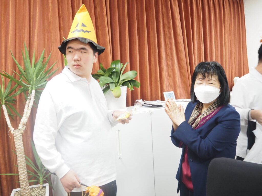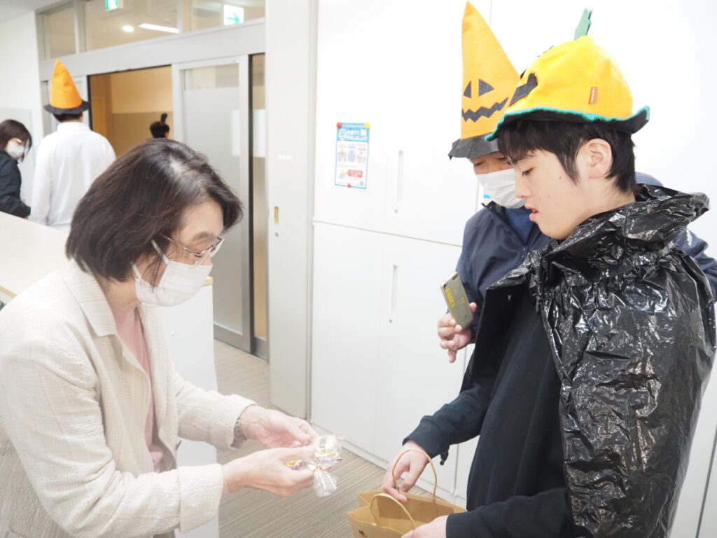 ハロウィンの仮装をした児童は、自分の名前を言ってから「お菓子をください」と一生懸命に伝え、小松啓子理事長や本部職員からお菓子を手渡された。お菓子を受け取った児童は嬉しそうな笑顔で「ありがとうございました」と伝え、その様子に小松理事長や本部職員、仮装し同行した職員からも笑みがこぼれた。そして、今回のような季節に応じたイベントなども通し、同事業の児童が経験の幅を広げていくことが期待された。