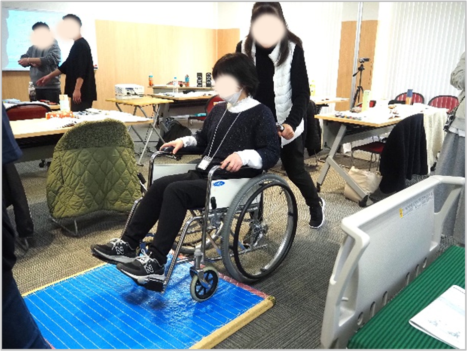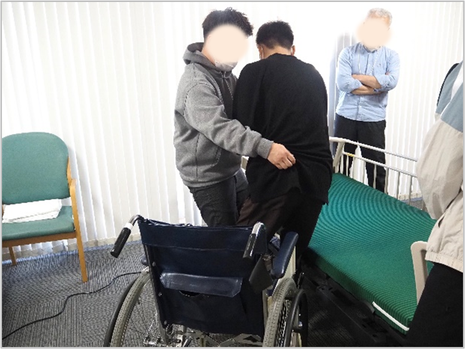 この日は、松隈毅副事業所長(ショートステイとばた)、山添結理主任(インクル若松)が講師を務め、「移動・移乗に関連したこころとからだのしくみと自立に向けた介護」について研修を行った。内容は、「移動・移乗の必要性と、移動・移乗に関連するこころとからだのしくみを理解する」、「利用者本人の力を活用し、移動・移乗の介護を行うための技術を身につける」、「心身機能の低下が移動・移乗に及ぼす影響について理解する」ことの3つで、スライドを活用しながらテキストに沿って具体例を挙げ講義、演習が行われた。演習では杖をついて歩く人、視覚に障害がある人の歩行介助、車いすの人の介助方法など実践を通し学んだ。受講生の中には初めて車いすなどの福祉用具に触れる人もおり、「支援の動きが難しいですね」などの感想を述べていたが、全員が積極的に演習にも参加。介助される側の役割の時には、「見えないのは本当に怖い」「車いすは想像以上に怖い」「実際に街中に出れば、かなり不安かもしれない」など互いに率直な気持ちを共有しながら真剣に実技に取り組む姿が見られた。