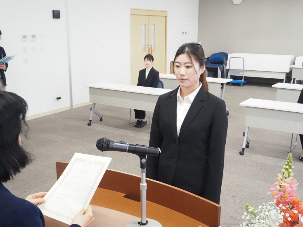 令和8年度「辞令交付式」/正規採用者5人が決意新たに法人育成会での第一歩スタート