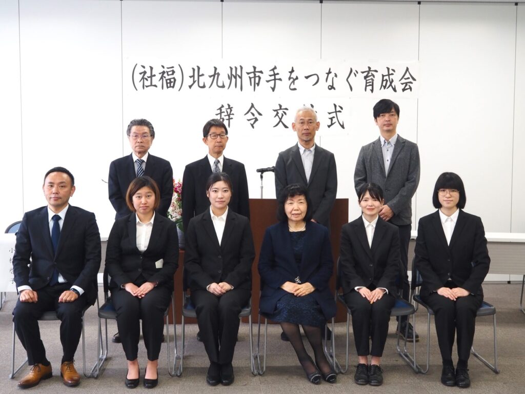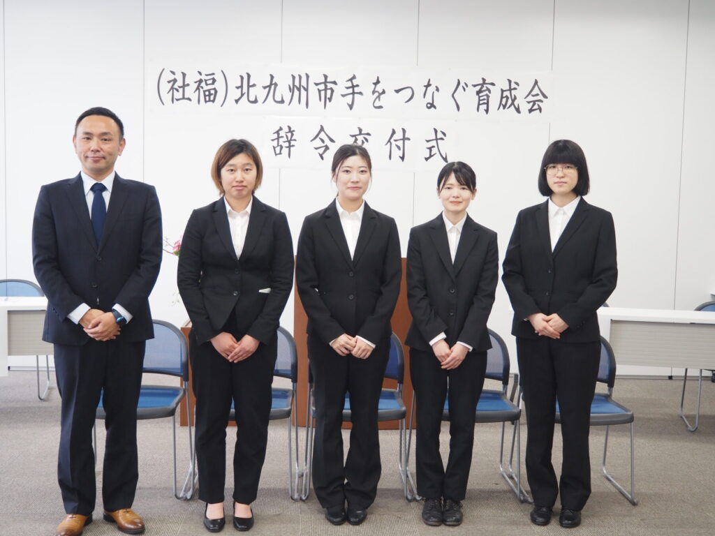 法人育成会の「令和8年度 職員辞令交付式」が4月1日、戸畑区の「育成会会館」で行われ、正規採用者5人が決意を新たに法人育成会でのキャリアをスタートさせた。
