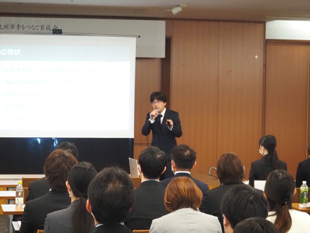 「令和8年度 法人事業説明会」が4月11日、戸畑区のウェルとばたで開催され、法人のミッションや目指すべき心理的安全性などを確認するとともに法人内の生成AIの取り組みが説明され、後半は8人の職員が令和7年度の実践研究について発表を行った。これには約100人の職員が参加した。