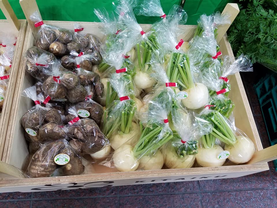 活動センターの野菜は、かぶ、ズッキーニ、唐辛子、ピーマン、人参、生姜、菊芋、鬼柚子、ポトフセット(間引きした人参・かぶ、)もち米、芋づるで作ったクリスマスリーフの材料セット、自然栽培もち米の稲藁で、しめ縄やインテリア用につくったキット、そしてスナップえんどうの苗と13品目のアイテムをそろえた。